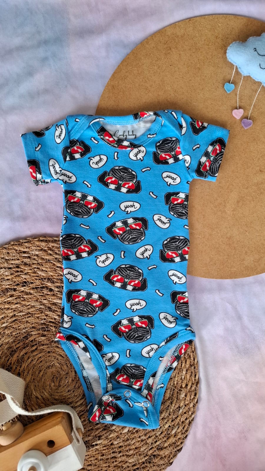 Body manga curta confeccionado em Cotton 96% algodão, 4% elastano, macio e flexível. Absorve o suor e permite que a pele do bebê respire, mantendo-o confortável.