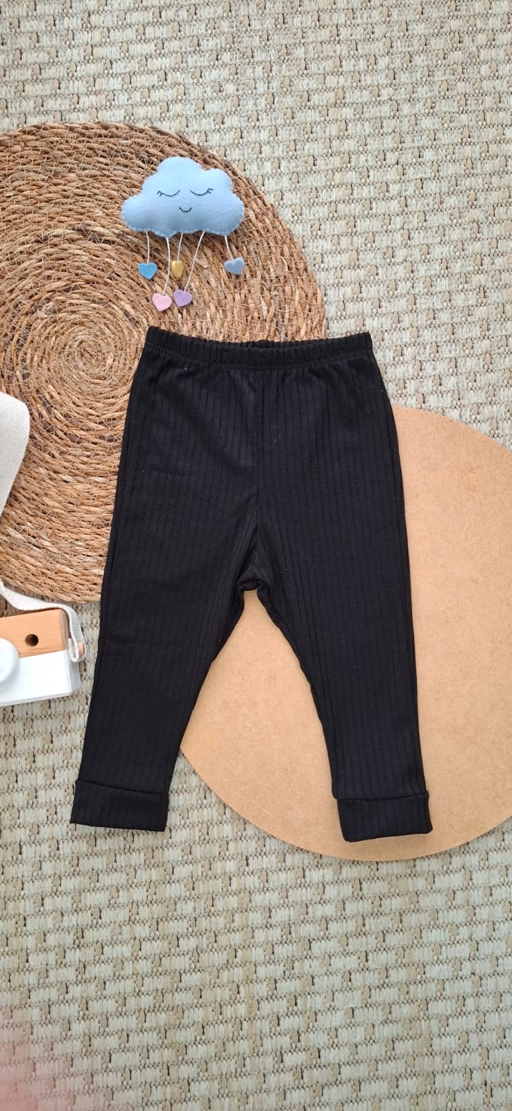 Calça confeccionada em ribana canelada, macia e flexível. Absorve o suor e permite que a pele do bebê respire, mantendo-o confortável.