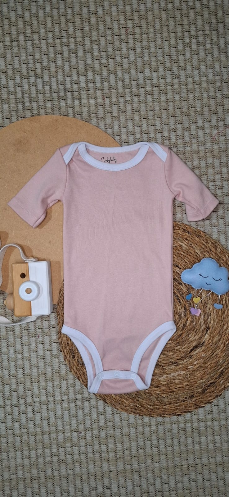 Body manga curta confeccionado em suedine 100% algodão, macio e flexível. Absorve o suor e permite que a pele do bebê respire, mantendo-o confortável.