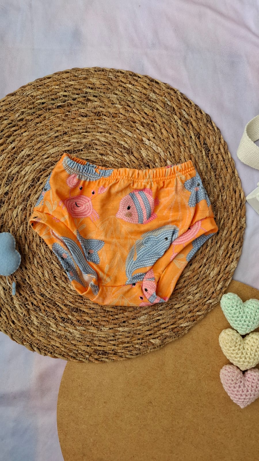 Tapa fraldas confeccionado em malha 100% algodão, macia e flexível. Absorve o suor e permite que a pele do bebê respire, mantendo-o confortável.