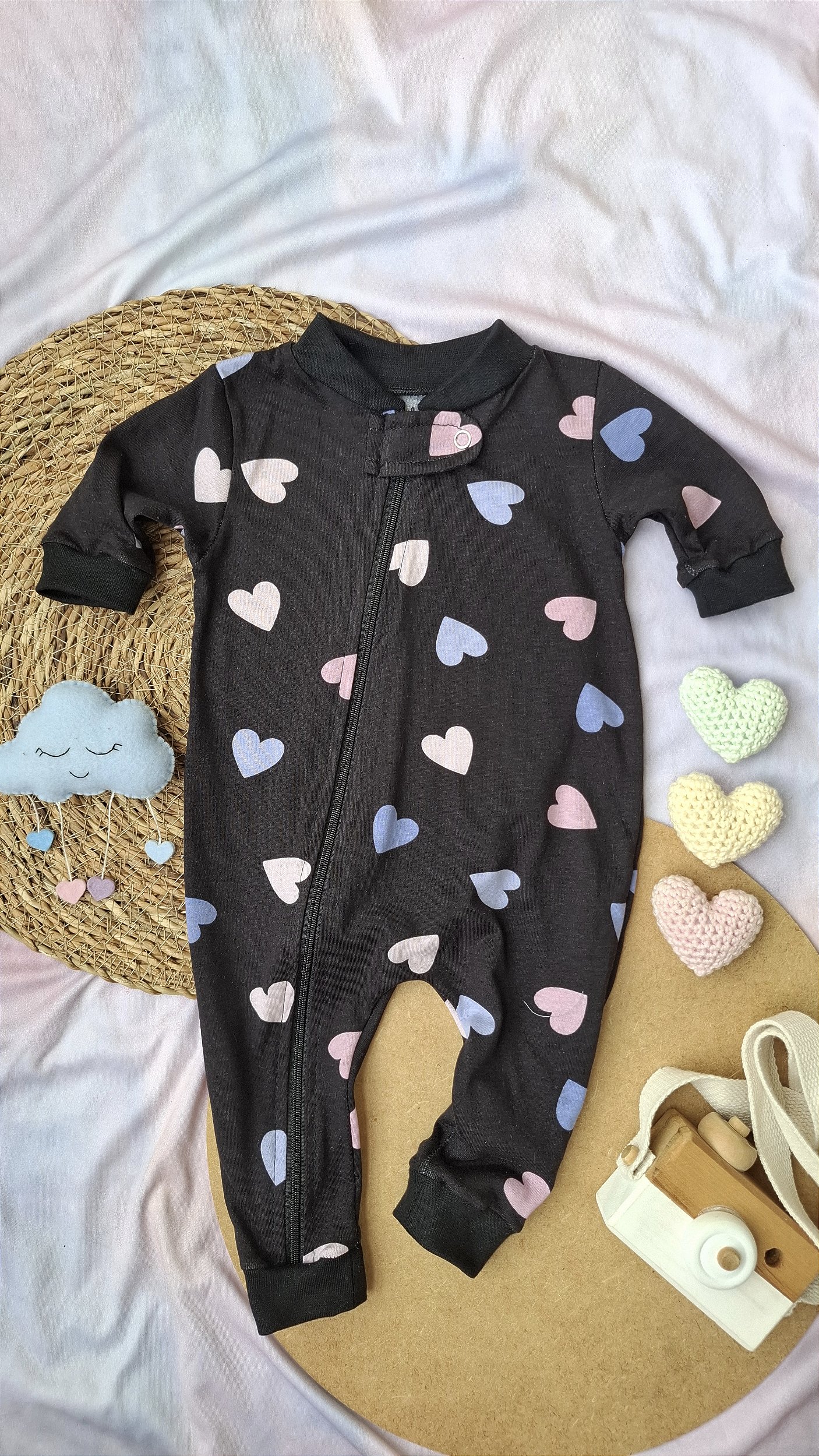 Possui fechamento por zíper transversal, facilitando a troca de fraldas.