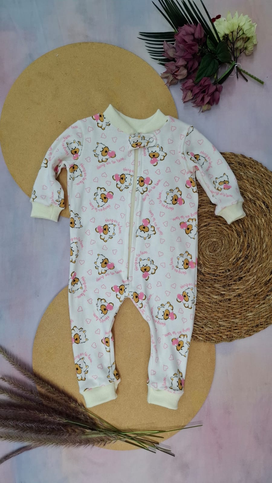 Macacão longo confeccionado em malha Suedine 100% algodão, macia e flexível. Absorve o suor e permite que a pele do bebê respire, mantendo-o confortável e aquecido na medida certa.