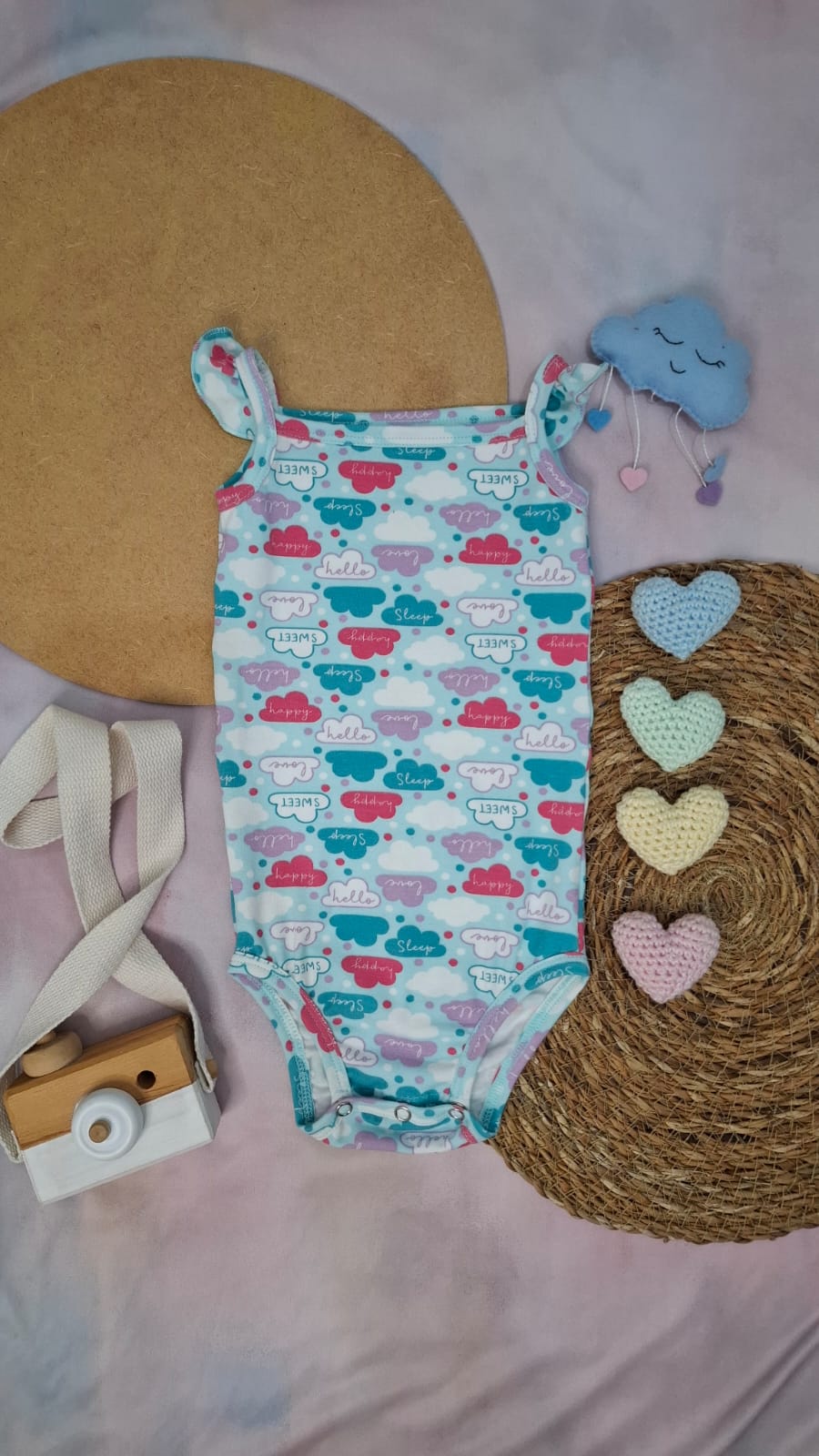 Body alcinha confeccionado em Cotton 96% algodão, 4% elastano, macio e flexível. Absorve o suor e permite que a pele do bebê respire, mantendo-o confortável.