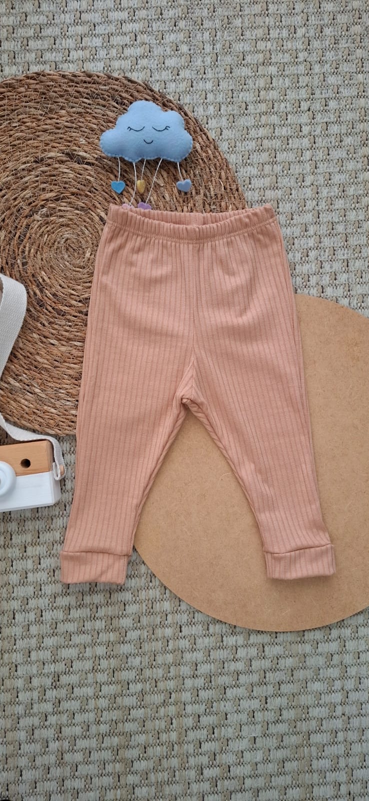 Calça confeccionada em ribana canelada, macia e flexível. Absorve o suor e permite que a pele do bebê respire, mantendo-o confortável.
